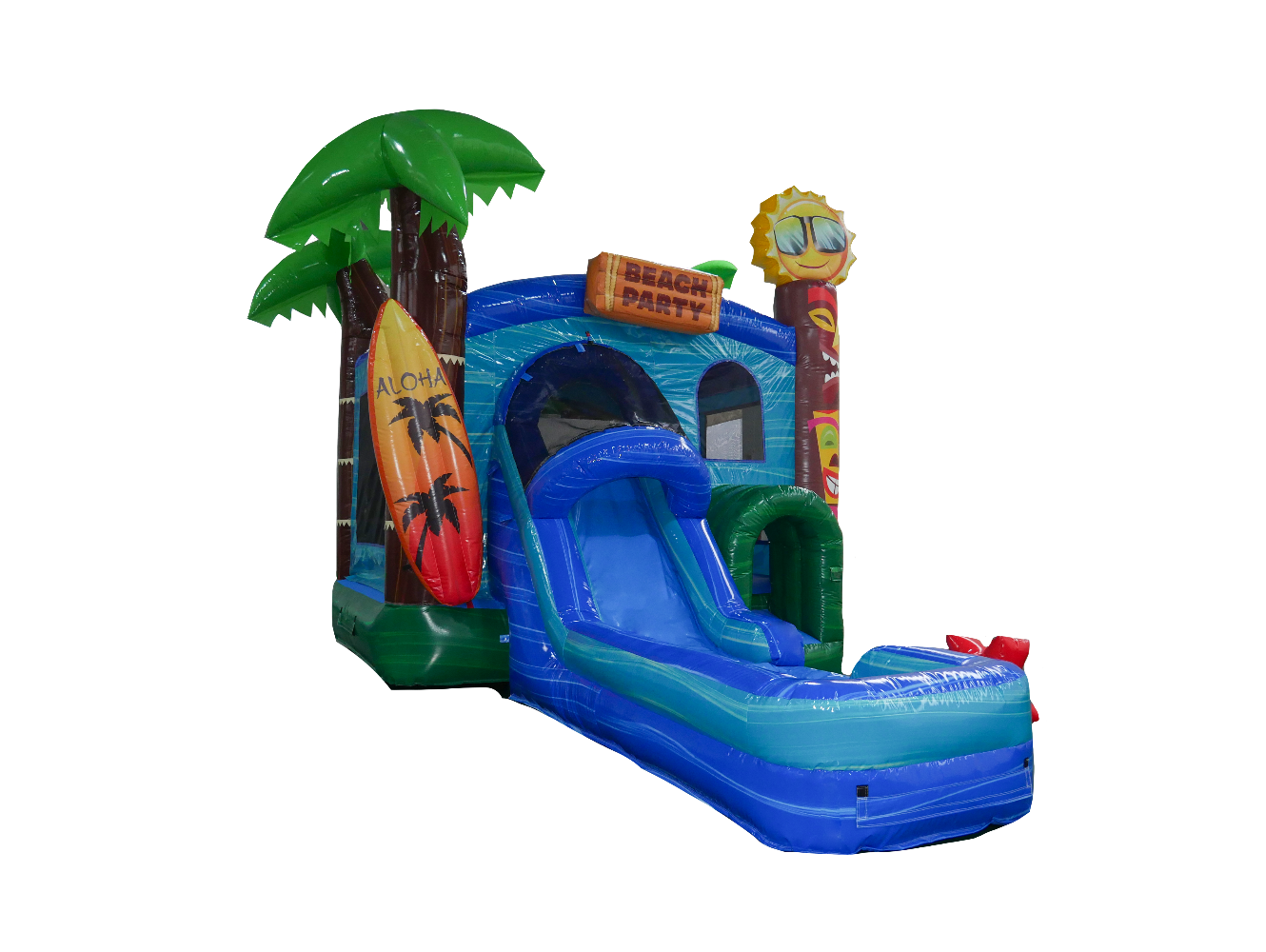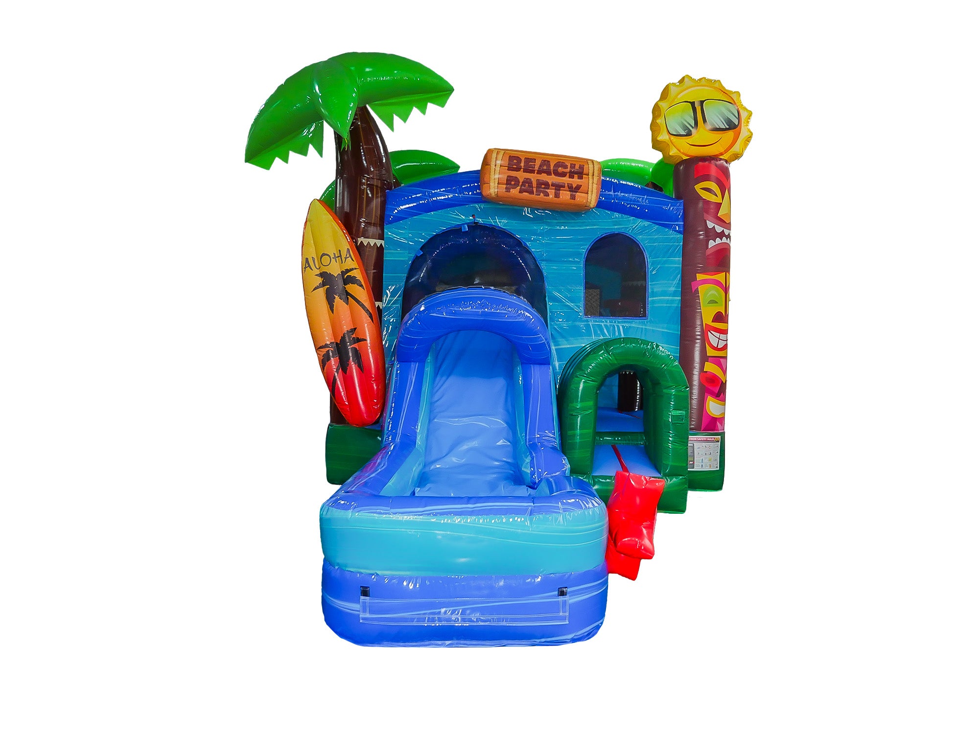 New for 2024, Hullaballoo's 4in1 Aloha Combo Wet/Dry is the perfect bounce house combo for any event, any time of the year. Bring the tropical fun all year round! This combo jumper comes with a water slide making it fun for anyone. With its beautiful tropical-them, 3D surfboard and cool sun, and beautifully printed Tiki graphics, this combo is the perfect addition to your inventory.