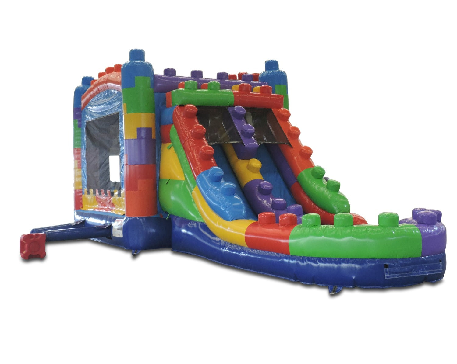 Our combos also include a new safety tunnel to enter the jumper and a safety net at the top of the slide, which includes a water mister. The bounce house combo has several zippers that make it easy for disinflation. The sliding area is hot welded to prevent any leaking into the jumper. Jump, slide or shoot some hoops this combo is fun wet or dry. This colorful castle-themed combo bouncy house is perfect for you. All of our Bounce House Combos are ASTM Compliant. They are made of fire retardant, high-quality, commercial vinyl. All Bounce House Combos are 100% lead-free. Create your very own water park with the water slide and pool or use it dry! These commercial 5in1 jumping Blocks combos are a fantastic investment for any rental company looking to add variety to their inventory. These combos have a no-hassle set-up and are safe for riders.