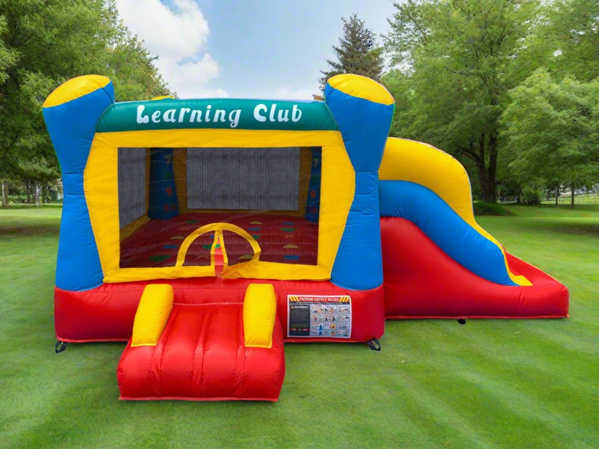 Hullaballoo Sales’ Learning Club Bounce House Slide is the perfect bounce house with slide for younger kids to enjoy, and learn at the same time. This compact and lightweight design features the alphabet, numbers 1-10, shapes, colors, and a dual lane slide. The Learning Club Bounce House Slide features a dual lane slide to add some extra fun.