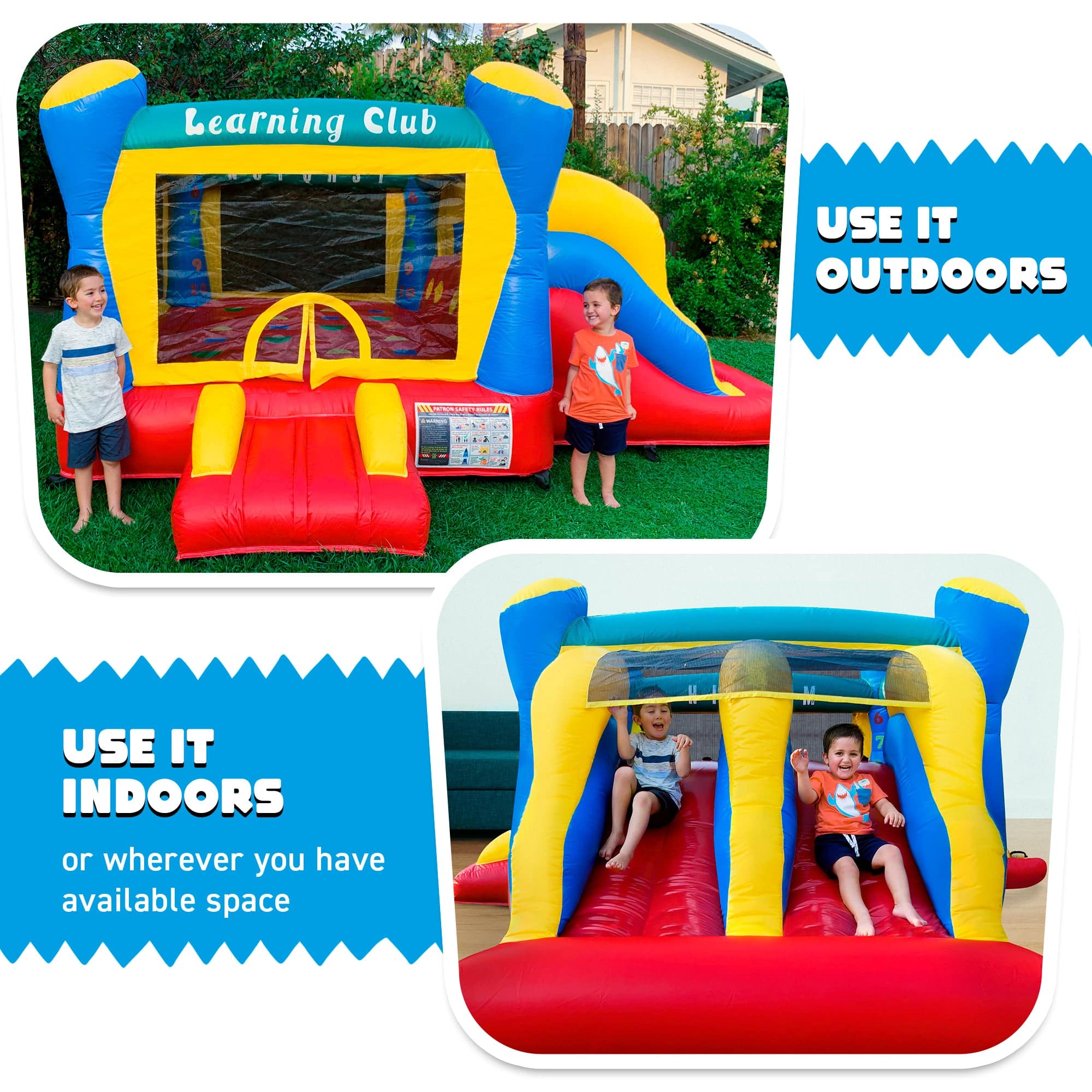 Includes: Learning Club Bounce House with Slide, 6 Stakes, Repair Kit, and Owners Manual.