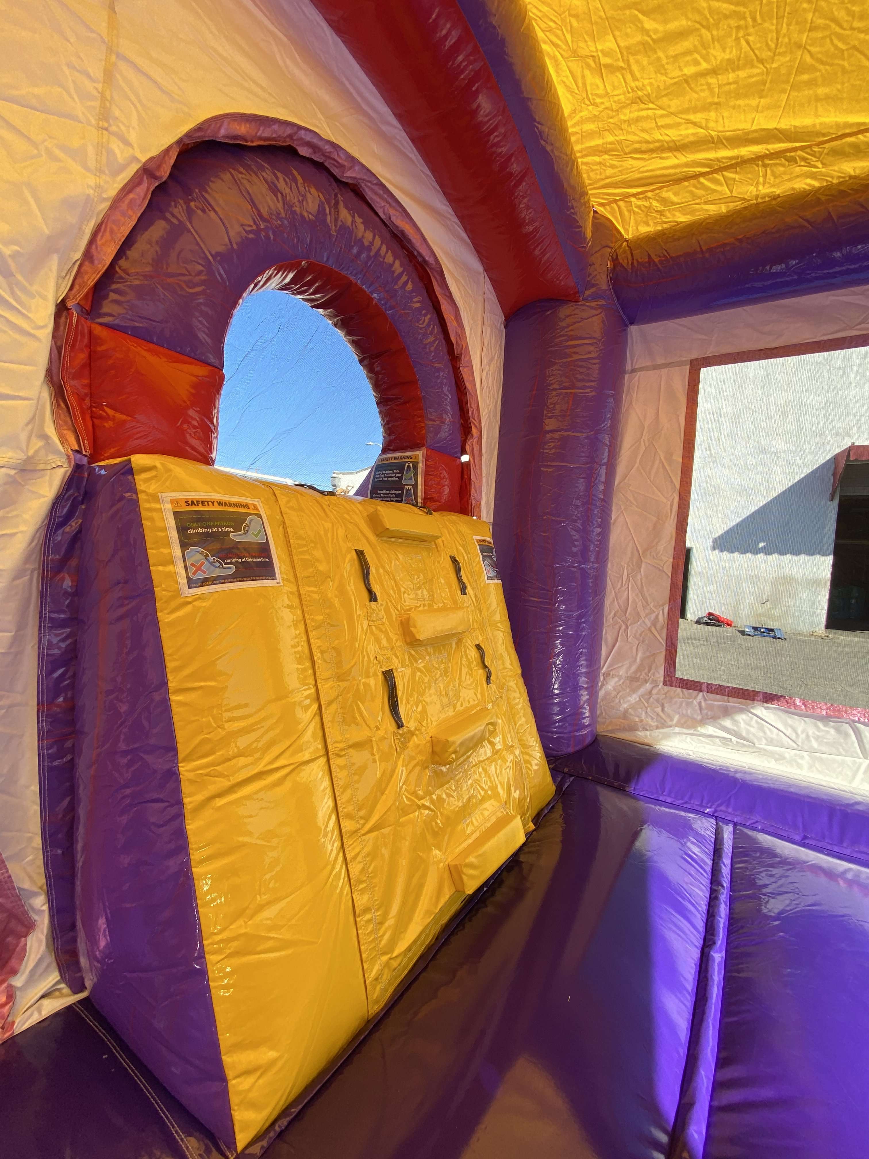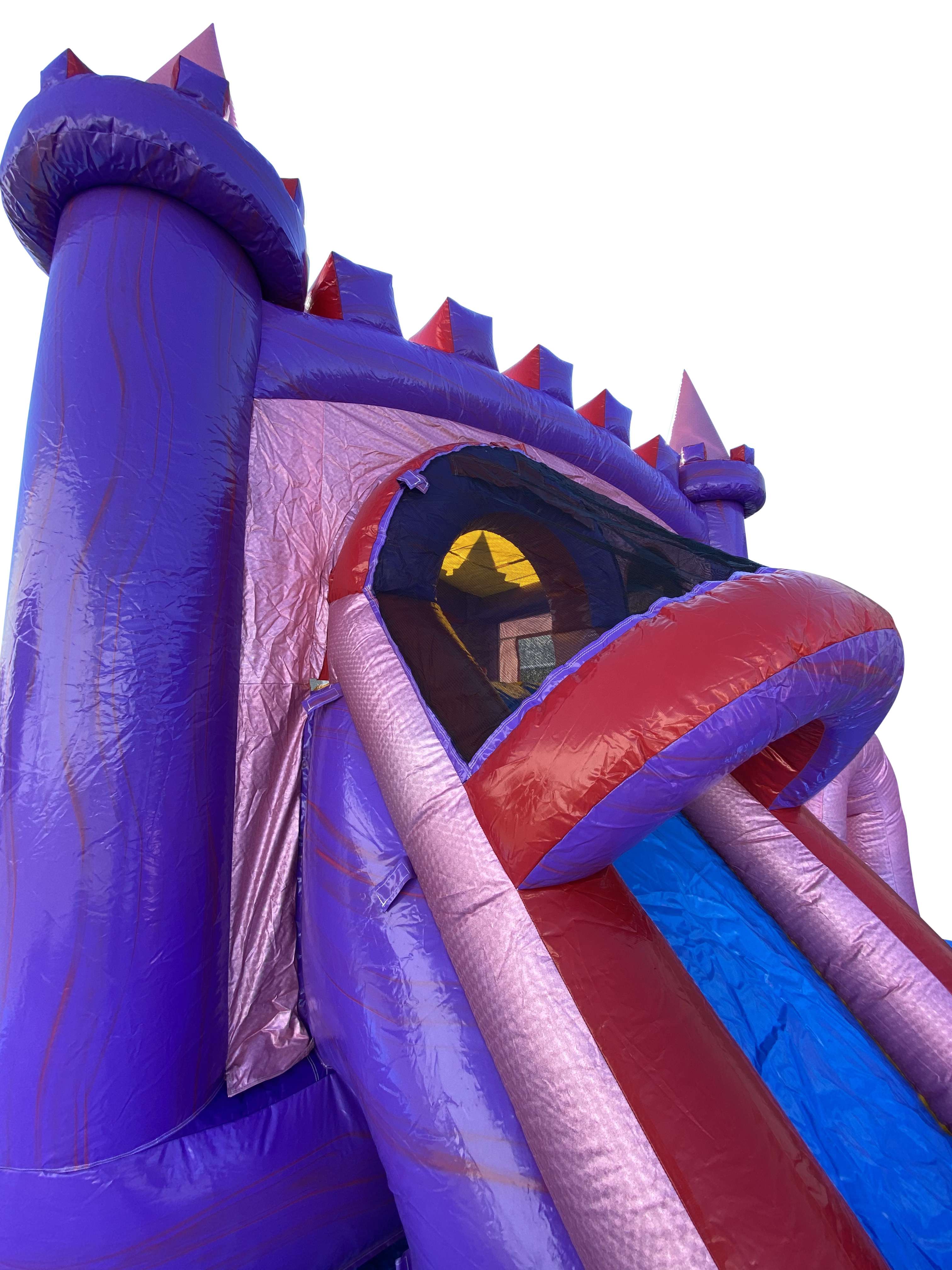 HullaBalloo's 4in1 Princess Combo Wet/Dry is the perfect bounce house for any time of the year. Great for any Summertime event or party, this combo jumper comes with a water slide making it fun for anyone. The 4in1 Princess Castle combo also includes a (1)indoor basketball court, a (2)rock-climbing wall, (3) Slide which can be used wet or dry and (4) an inflated pool area. Our combos also include a new safety tunnel to enter the jumper and a safety net at the top of the slide, which includes a water mister. The bounce house combo has several zippers that make it easy for disinflation. The sliding area is hot welded to prevent any leaking into the jumper. Jump, slide or shoot some hoops this combo is fun wet or dry. This colorful princess-themed combo bouncy house is perfect for you. All of our Bounce House Combos are ASTM Compliant. They are made of fire retardant, high-quality, commercial vinyl. All Bounce House Combos are 100% lead-free. Create your very own water park with the water slide and pool or use it dry! These commercial 4in1 jumping castle combos are a fantastic investment for any rental company looking to add variety to their inventory. These combos have a no-hassle set-up and are safe for riders.
