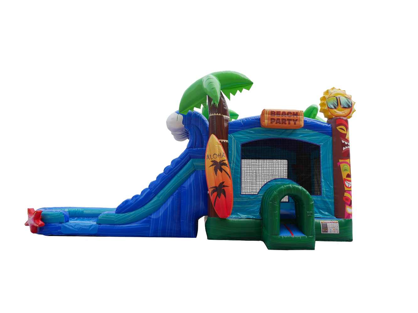 New for 2024, Introducing the incredible 5in1 Aloha Combo Wet/Dry from Hullaballoo. With its beautiful tropical-them, 3D surfboard and cool sun, and beautifully printed Tiki graphics, this combo is the perfect addition to your inventory. Great for any event or party, this combo jumper comes with a dual water slide making it fun for anyone. The 5in1 Aloha combo also includes a (1) indoor basketball court, a (2) rock-climbing wall, (3, 4) Dual Slides which can be used wet or dry and (5) an inflated pool area.