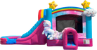 Our combos also include a new safety tunnel to enter the jumper and a safety net at the top of the slide, which includes a water mister. The bounce house combo has several zippers that make it easy for disinflation. The sliding area is hot welded to prevent any leaking into the jumper. Jump, slide or shoot some hoops this combo is fun wet or dry. This colorful enchanted-themed combo bouncy house is perfect for you. All of our Bounce House Combos are ASTM Compliant. They are made of fire retardant, high-quality, commercial vinyl. All Bounce House Combos are 100% lead-free. Create your very own water park with the water slide and pool or use it dry! These commercial 5in1 jumping Enchanted combos are a fantastic investment for any rental company looking to add variety to their inventory. These combos have a no-hassle set-up and are safe for riders.