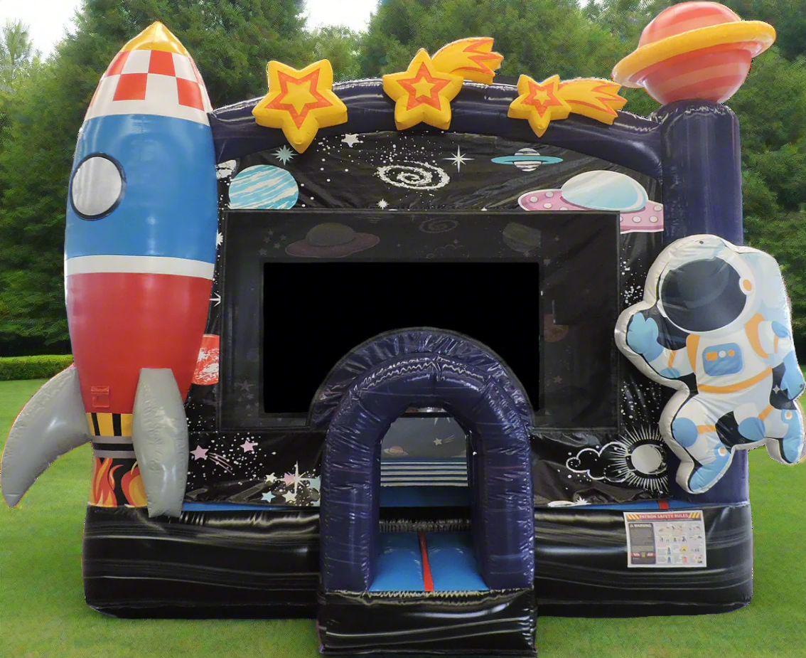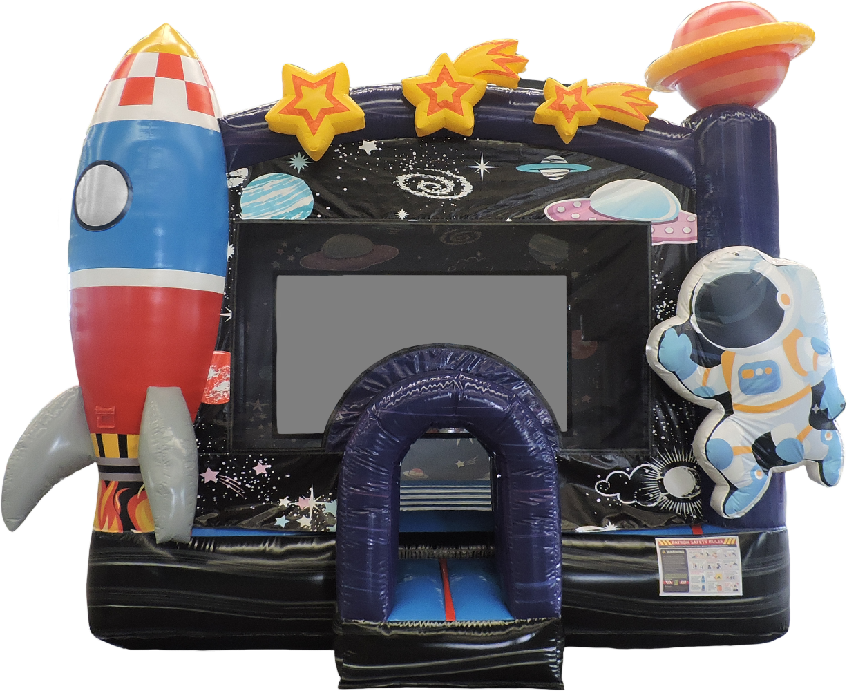 New for 2024, our Galaxy Voyager Bounce House 13x13 is sure to bring some out of this world adventure to your event. The Galaxy Voyager bounce house is great for all ages and genders. This space-themed, show-stopping Bounce House is excellent for outdoor birthday parties and or backyard events. Features a 3D spaceship and astronaut, including beautiful printed space themes and shooting stars. The Galaxy Voyager Bounce house also includes a new safety tunnel to get in and out of the bounce house. All of our Bounce Houses are ASTM Compliant. They are made of fire retardant, high-quality, commercial vinyl. All Bounce Houses are 100% lead-free. Rental operations are sure to benefit from including this space-themed bounce house in their inventory. The Galaxy Voyager Bounce House is lightweight and compact for easy transport and set up in almost any yard. HullaBalloo Sales' Galaxy Voyager Bounce House is just what your rental inventory needs to stand out from the rest. HullaBalloo offers the best inflatables at the most reasonable price.