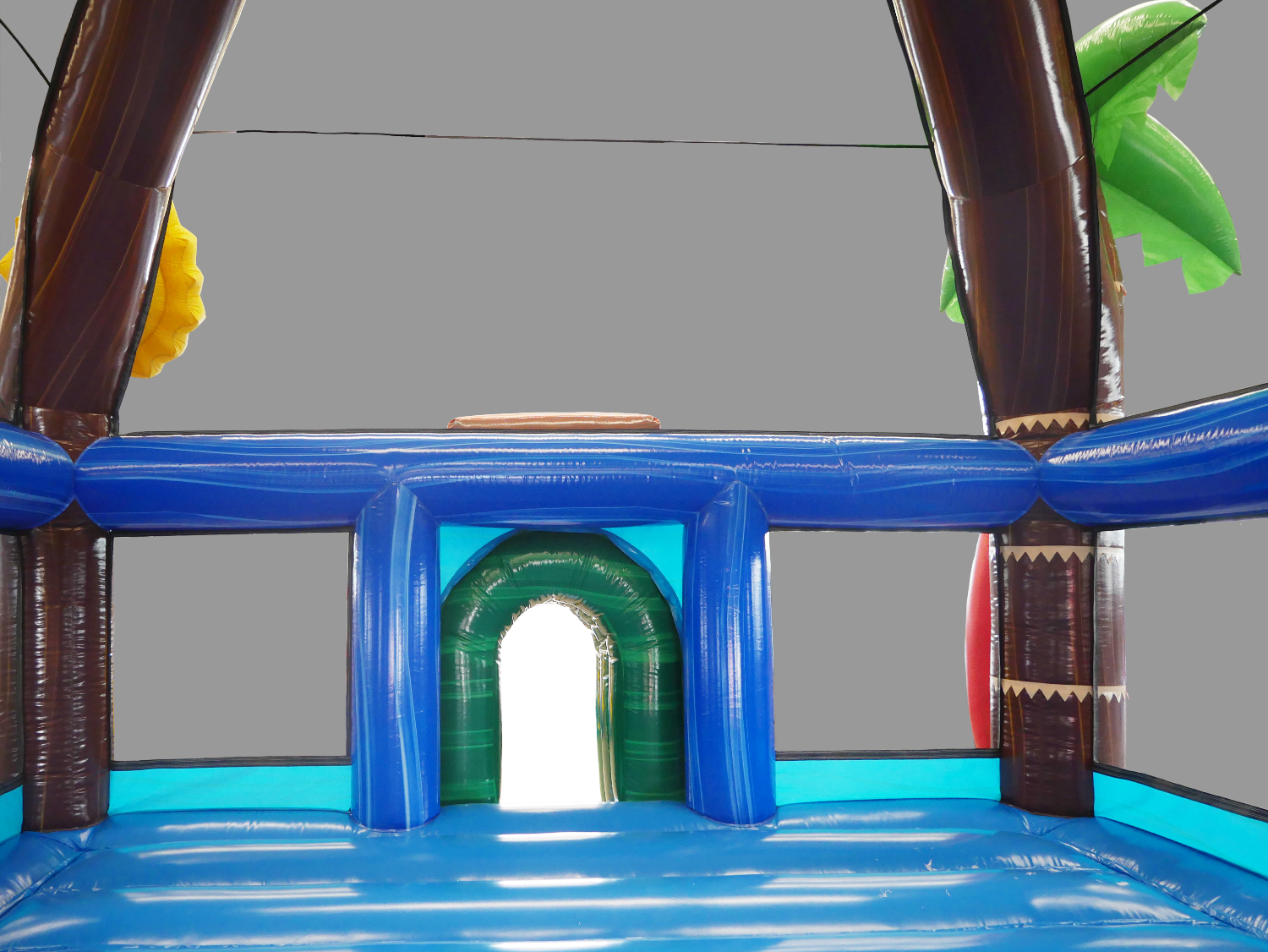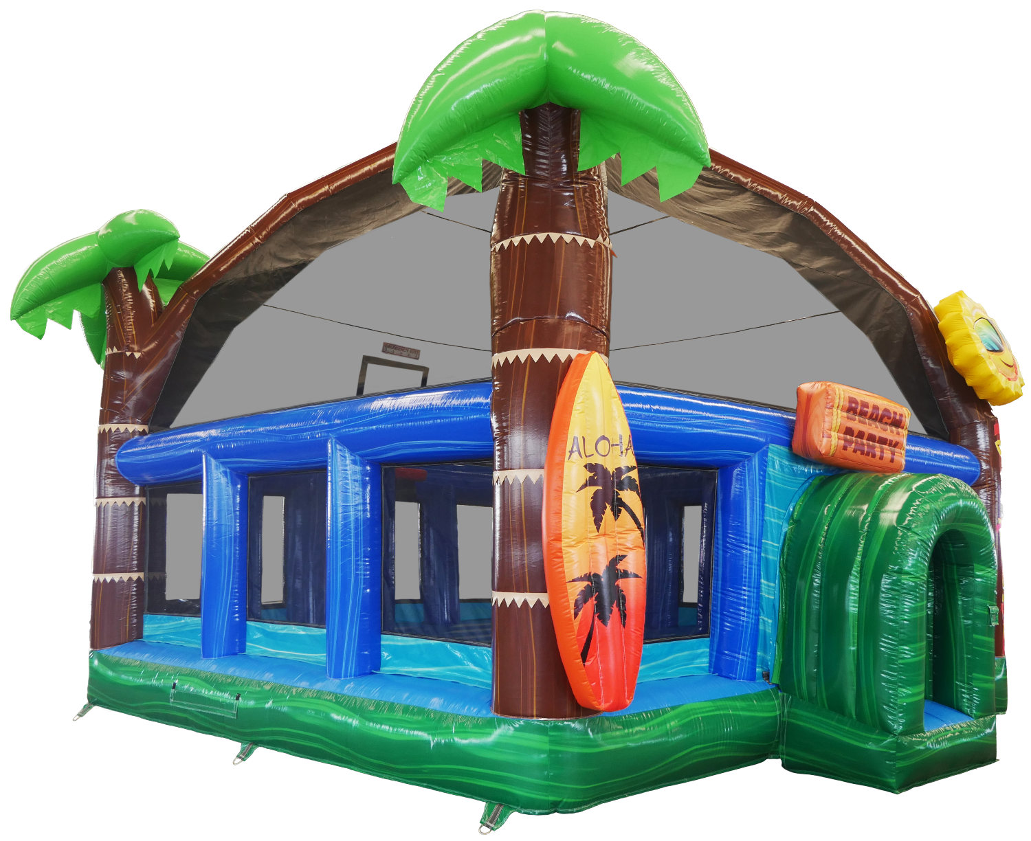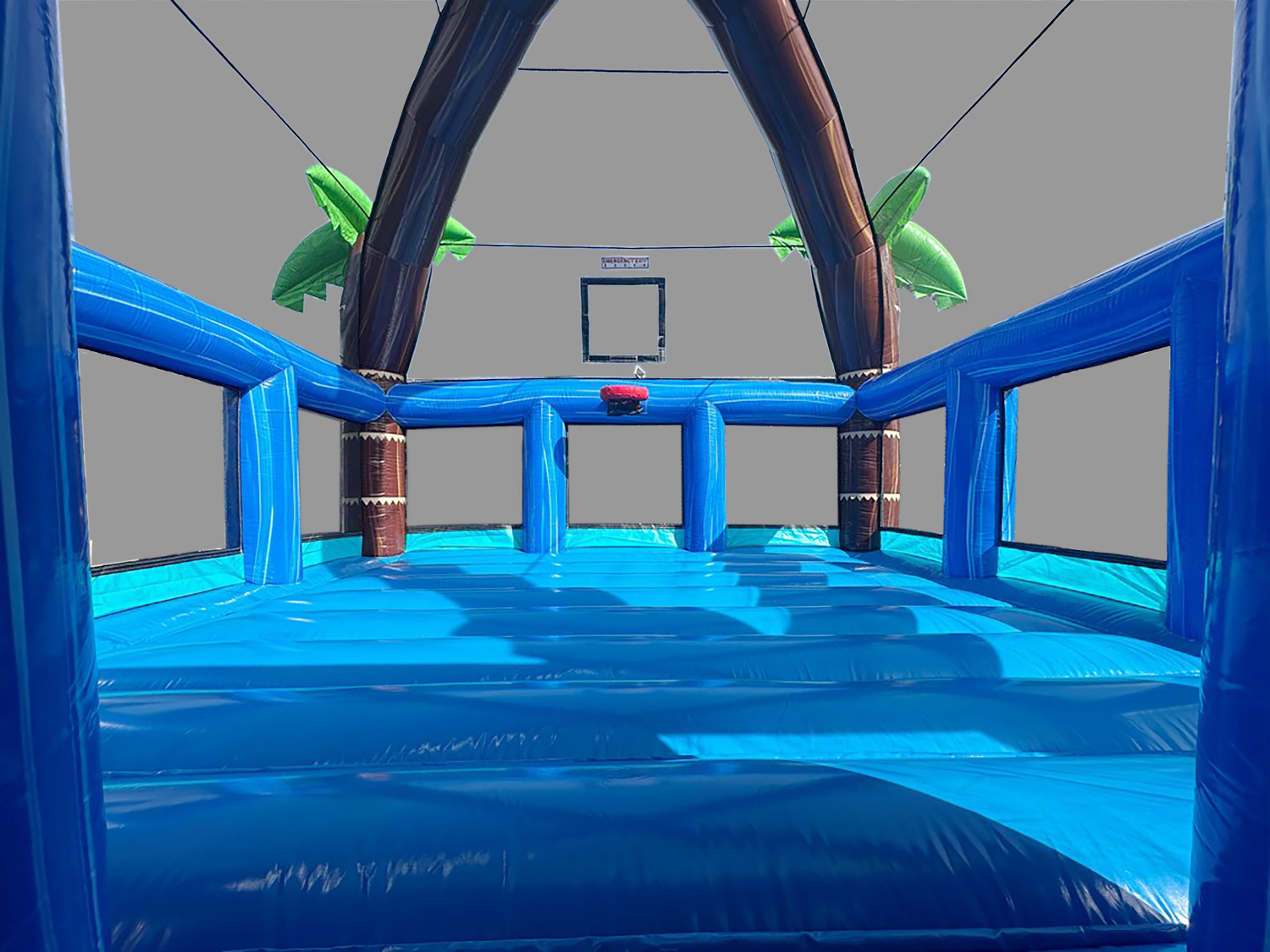 New for 2025. The Jumbo Aloha Bounce House brings the spirit of the islands to life with its massive size and vibrant design. Featuring lifelike palm trees, 3D inflatable popups of a surfboard and a cool sun, along with beautifully printed Tiki graphics, this spacious inflatable is perfect for large gatherings, outdoor birthday parties or backyard events. The Jumbo Aloha Bounce House also features a built-in inflated basketball hoop. There is plenty of room for kids to jump, bounce, play and practice their shooting skills or slam dunks! Idealfor all ages and genders, it’s the ultimate tropical adventure and is the perfect addition to your rental inventory.