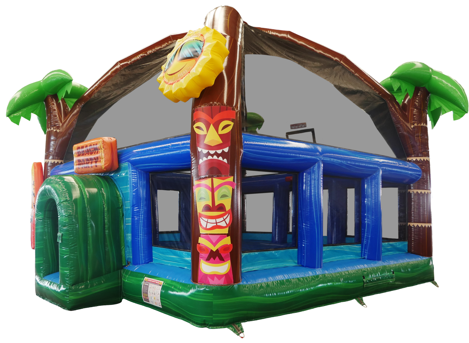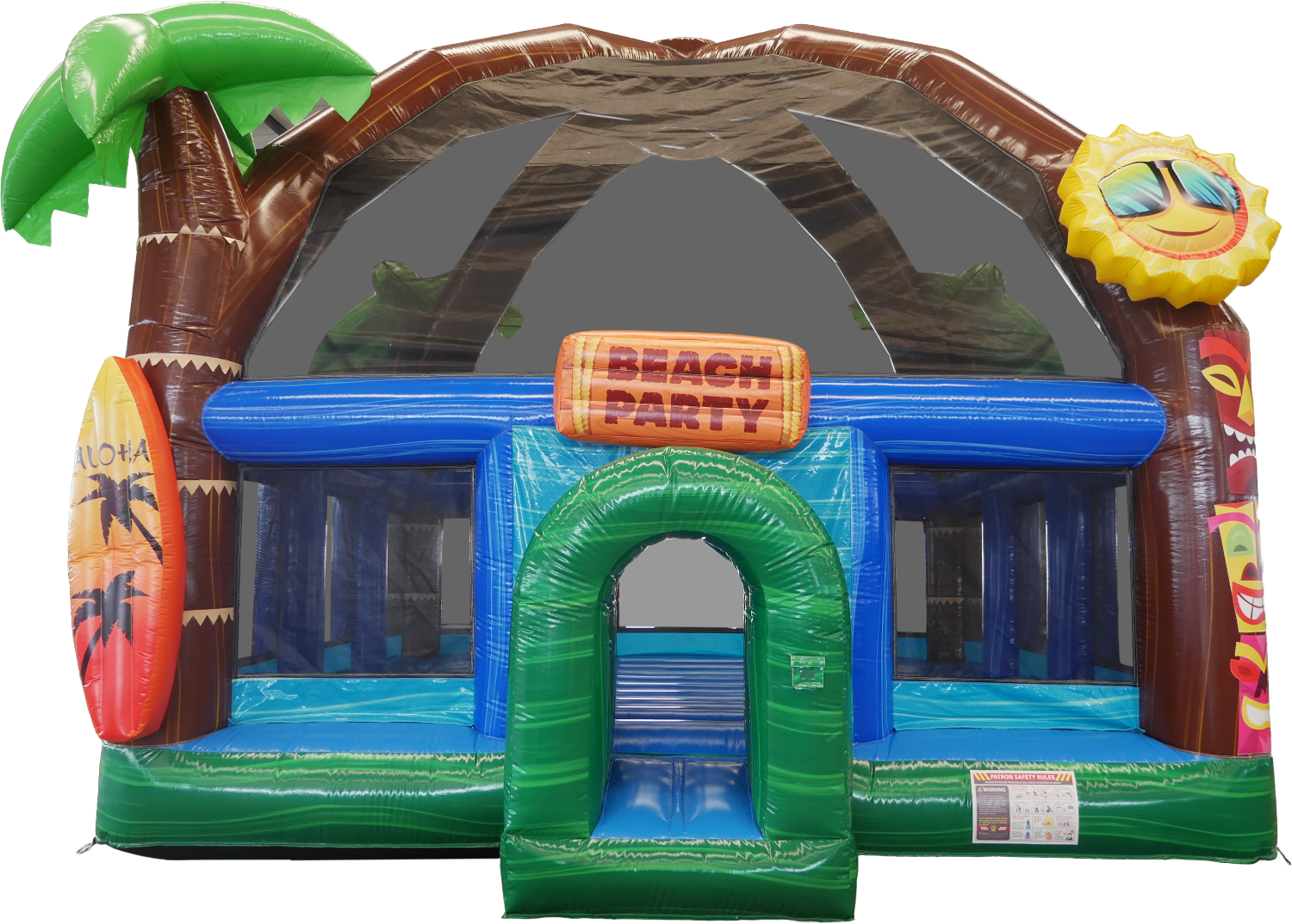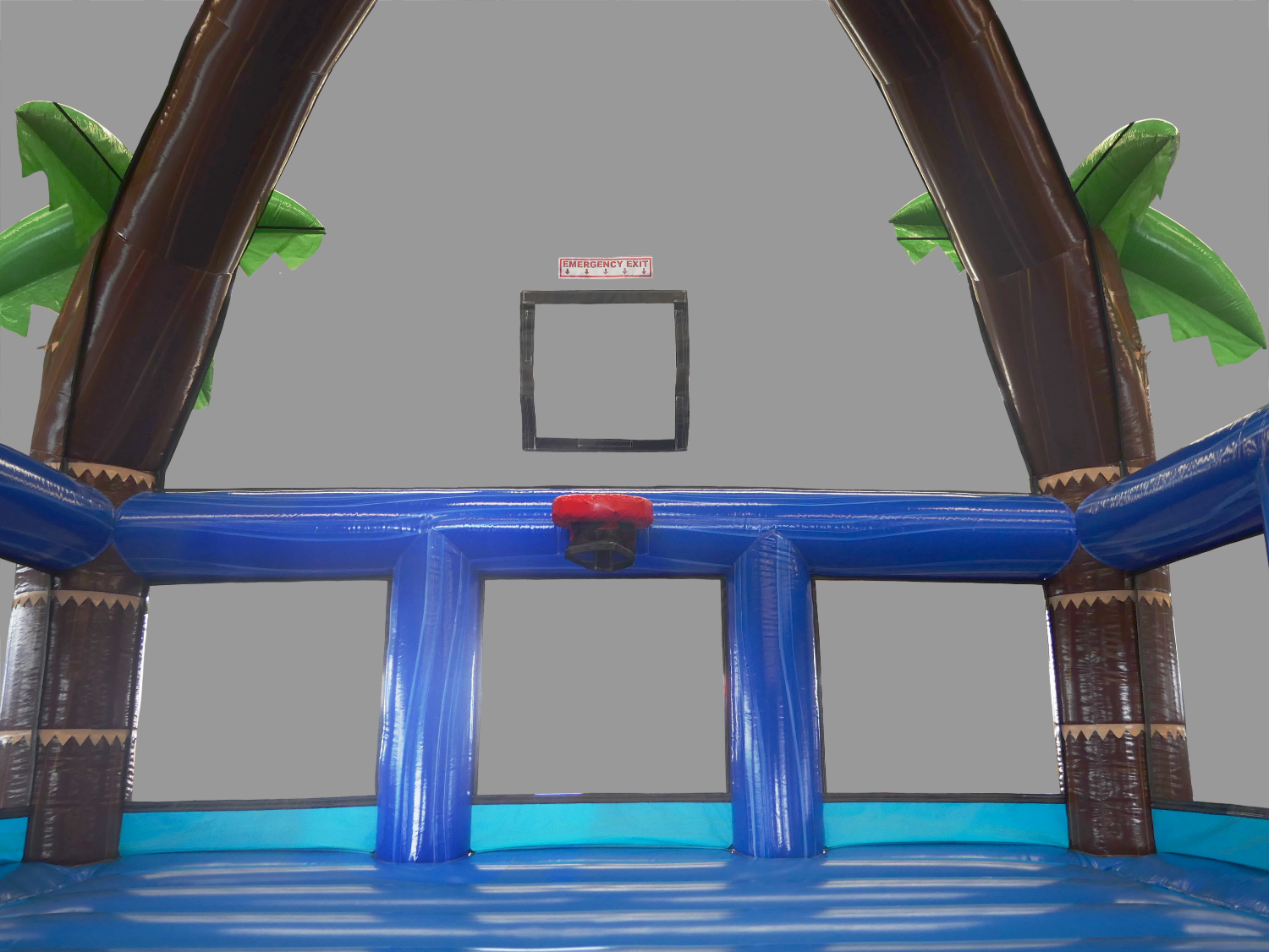 New for 2025. The Jumbo Aloha Bounce House brings the spirit of the islands to life with its massive size and vibrant design. Featuring lifelike palm trees, 3D inflatable popups of a surfboard and a cool sun, along with beautifully printed Tiki graphics, this spacious inflatable is perfect for large gatherings, outdoor birthday parties or backyard events. The Jumbo Aloha Bounce House also features a built-in inflated basketball hoop. There is plenty of room for kids to jump, bounce, play and practice their shooting skills or slam dunks! Idealfor all ages and genders, it’s the ultimate tropical adventure and is the perfect addition to your rental inventory.