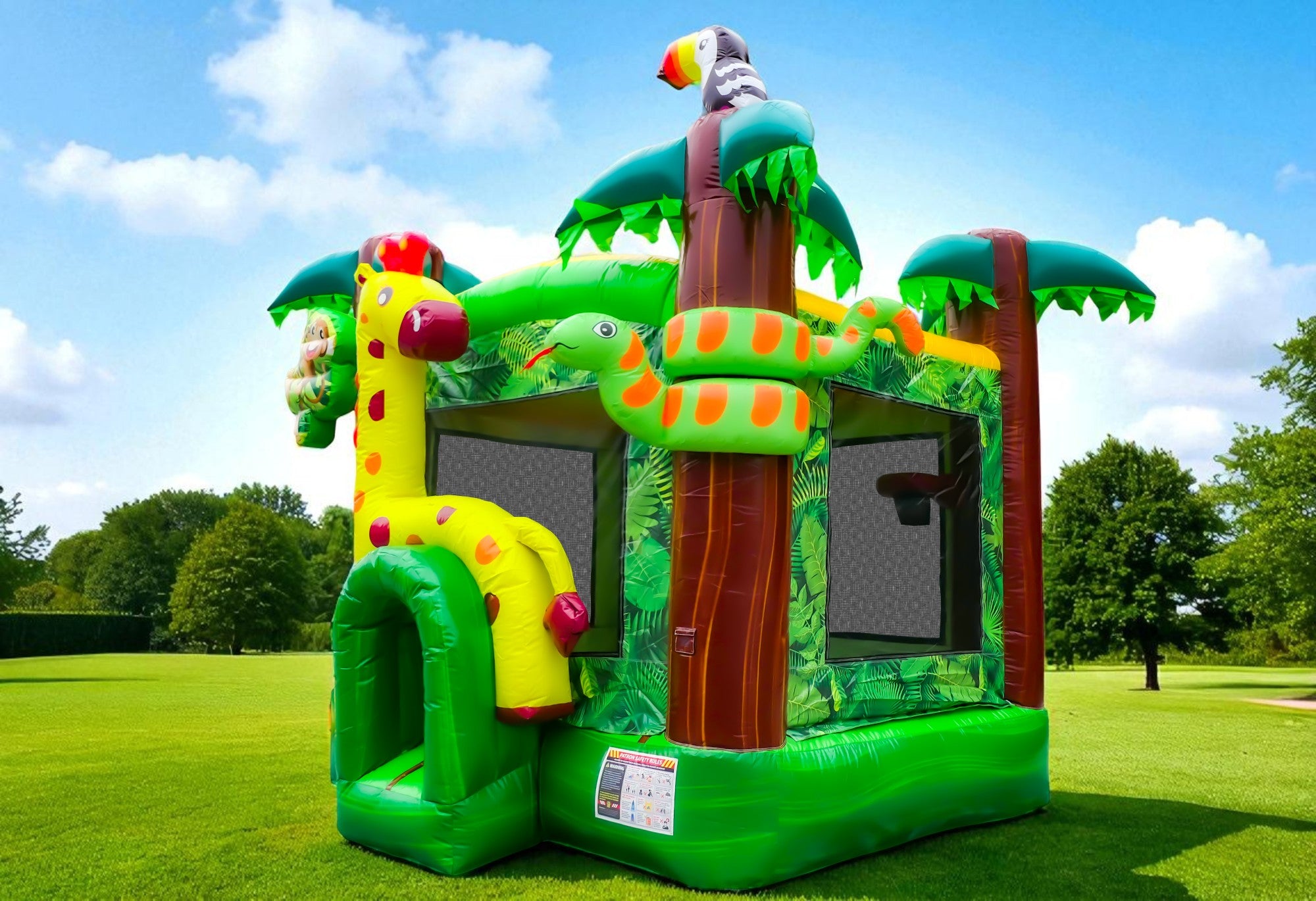 HullaBalloo Sales' Jungle Bounce House is sure to bring some adventure and excitement to your next event, along with some wild creatures. The Jungle bounce house is great for all ages and genders. This show-stopping Bounce House is excellent for outdoor birthday parties and or backyard events. Features 3-D inflated animals on the front including a big Giraffe, a swinging Monkey, Snake and a Toucan on the tree top. With printed jungle graphics on all 4 walls, it is sure to give riders a feel as if they are exploring the Jungle in their own backyard.