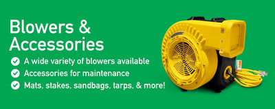 All the inflatables come with a Blower, Tarp, and Repair Kit. Stakes or sand bags for anchoring are not included and must be ordered separately.