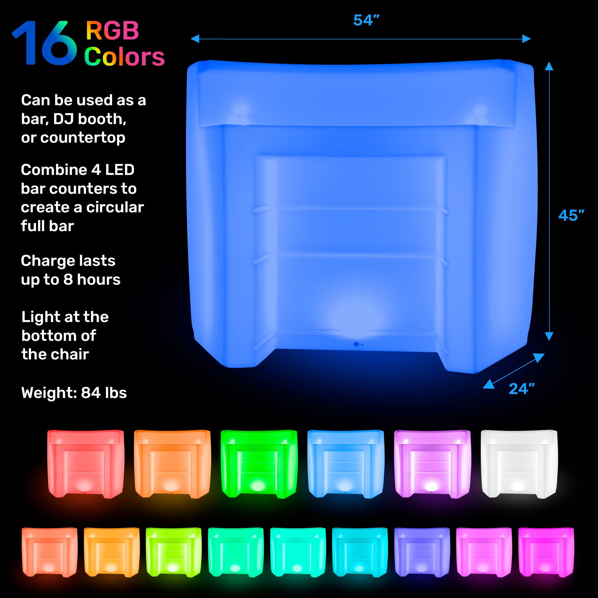 HullaBalloo Sales LED furniture is perfect for standing out from the rest. This LED bar counter can be used as a bar, DJ booth, or countertop. You can combine 4 LED bar counters to make a circle to create a full bar. The LED light is located at the bottom of the counter. Charger and remote are included. The charge for the LED bar counter lasts up to 8 hours. Shop HullaBalloo Sales LED Furniture for all your party rental needs!