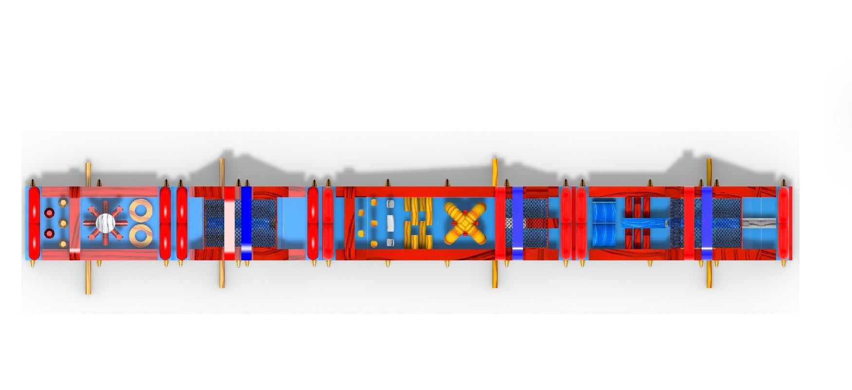 Two riders can play at a time as they race through countless different elements. Riders start off by going through the entrance (1) red arches, (2) vertical cone popups , (3) hanging vertical popups, (4) unique obstacle structure, (5) tire run obstacle, (6) dual red arches, (7) dual lane climber, (8) dual lane slide, (9) dual red arches. The second obstacle piece has (10) vertical popups hanging, (11) vertical wall, (12) horizontal popups, (13) unique X shaped obstacle structure, (14) dual lane slide, and (15) red arches. The last obstacle piece has (16) tunnel entrance, (17) horizontal popups, (18) dual lane climber, and lastly a (19) dual lane slide.