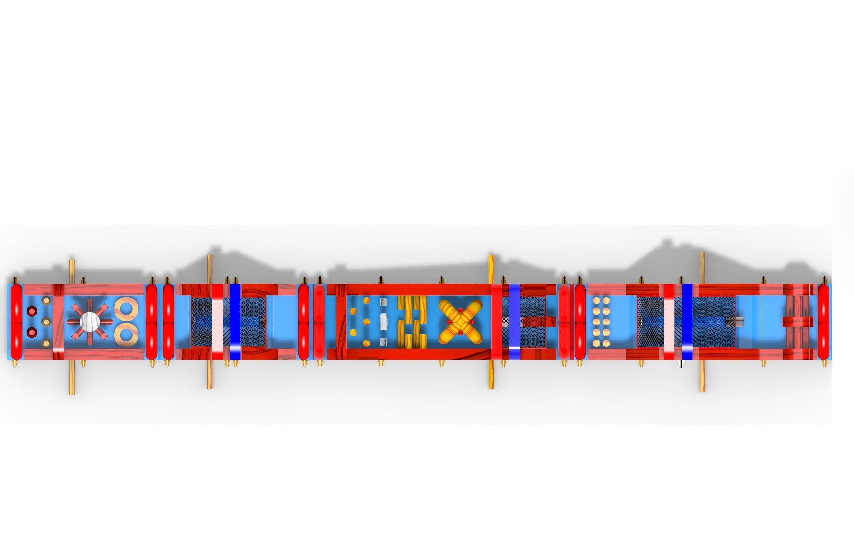Two riders can play at a time as they race through countless different elements. Riders start off by going through the entrance (1) red arches, (2) vertical cone popups , (3) hanging vertical popups, (4) unique obstacle structure, (5) tire run obstacle, (6) dual red arches, (7) dual lane climber, (8) dual lane slide, (9) dual red arches. The second obstacle piece has (10) vertical popups hanging, (11) vertical wall, (12) horizontal popups, (13) unique X shaped obstacle structure, (14) dual lane slide, and (15) red arches. The last obstacle piece has (16) vertical popups, (17) dual lane climber, (18) dual lane slide, and lastly (19) horizontal popups.