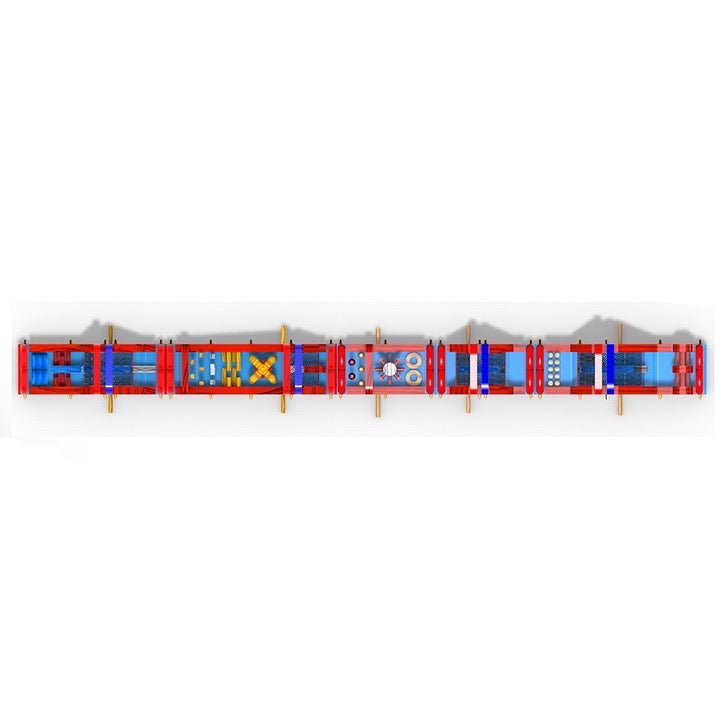 Two riders can play at a time as they race through countless different elements. Riders start off by going through the entrance (1) red arches, (2) tunnel crawl , (3) horizontal popups, (4) unique obstacle structure, (5) dual lane climber, (6) dual lane slide, and (7) dual red arches. The second obstacle piece has (8) vertical popups hanging, (9) vertical wall, (10) horizontal popups, (11) unique X shaped obstacle structure, (12) dual lane slide, and (13) red arches. The next obstacle piece has (14) horizontal cone popups, (15) vertical hanging popups, (16) unique shaped popups, (17) tire run, (18) dual red arches, (19) dual lane climber, (20) dual lane slide, and (21) dual red arches. The final obstacle piece has (22) vertical popups, (23) dual lane climber, (24) dual lane slide, and finally (25) horizontal popups.