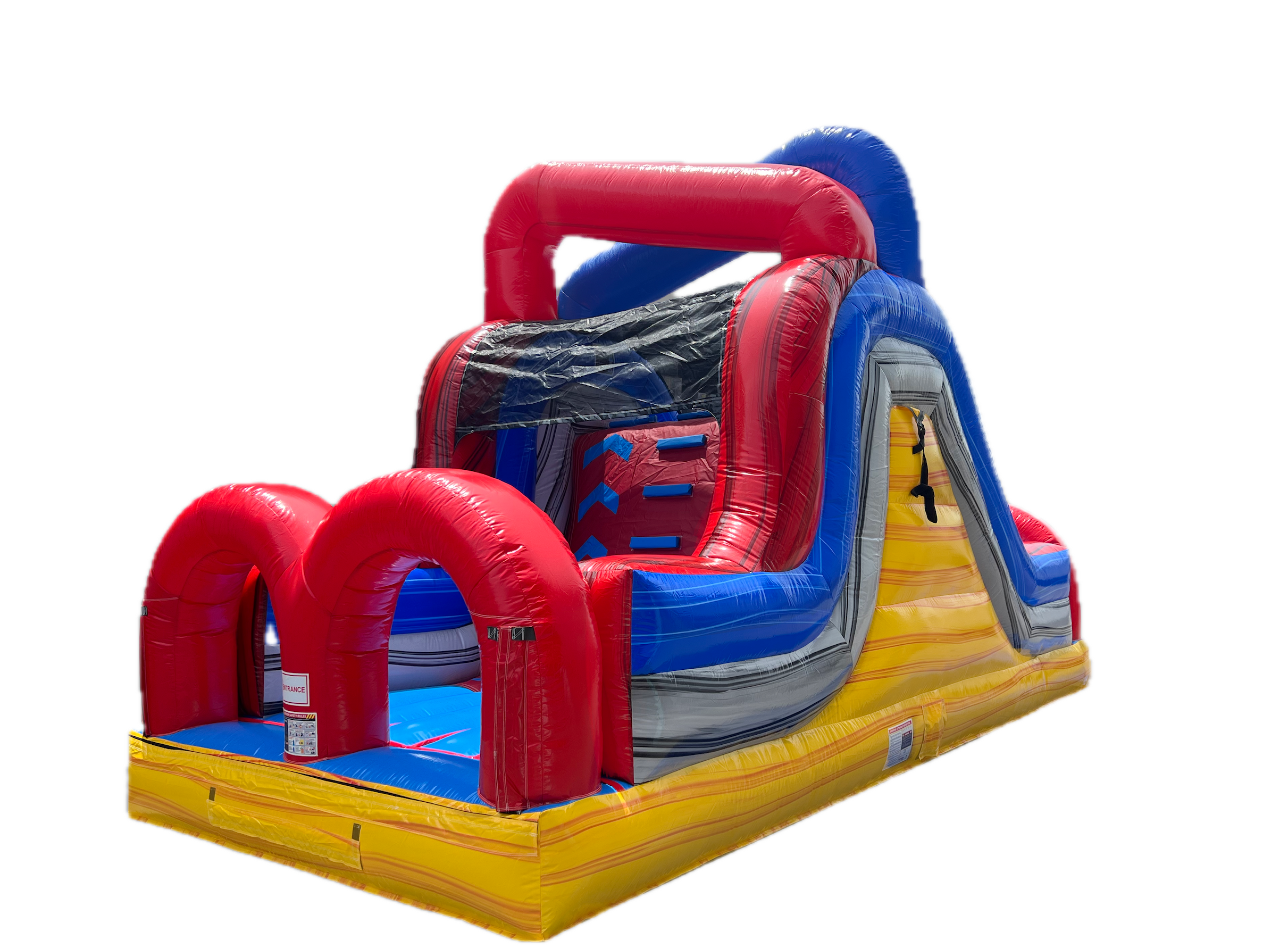 Race through this unique 25' Warped Wall Obstacle Course inflatable race course. This 2 person obstacle course is a fun and unique race course for kids to adults of all ages. Manufactured with commercial grade PVC vinyl for the commercial party rental or indoor play center industry, or even for private backyard use, it is made with great quality and workmanship.