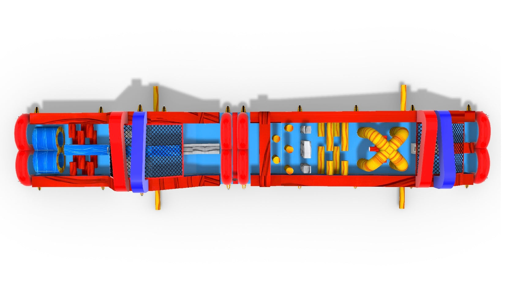 Two riders can play at a time as they race through countless different elements. Riders start off by going through the entrance (1) red arches, then under the (2) tunnels and around the (3) horizontal popups, now riders climb the (4) climbing wall and down the (5) dual lane slide and out the (6) red arches. The second piece of the 65' Obstacle Course has (7) vertical popups hanging, (8) vertical wall, (9) horizontal popups, (10) X shaped obstacle structure, and lastly (11) dual lane slide down to the finish line.