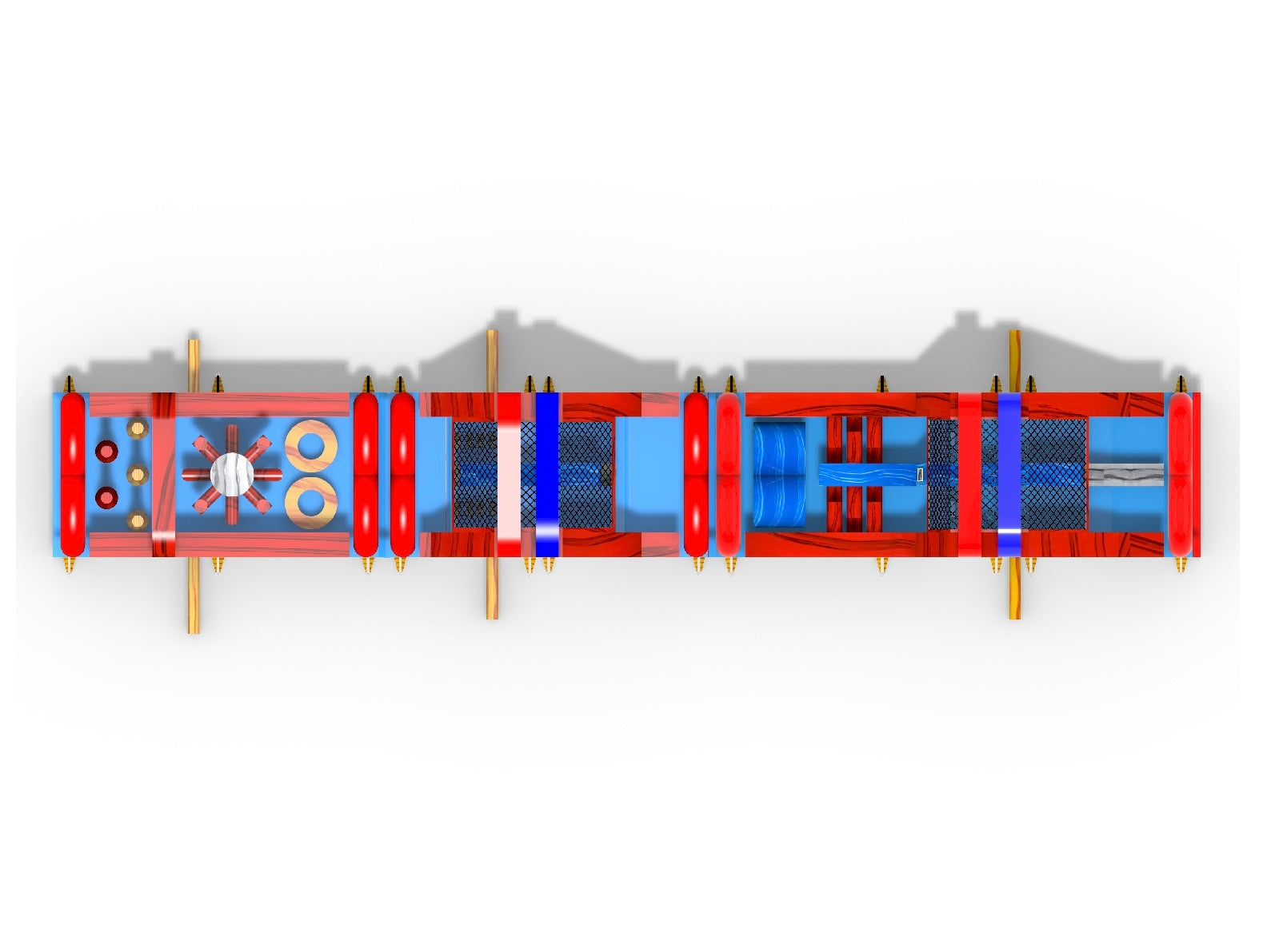 Two riders can play at a time as they race through countless different elements. Riders start off by going through the entrance (1) red arches, (2) vertical cone popups , (3) hanging vertical popups, (4) unique obstacle structure, (5) tire run obstacle, (6) dual red arches, (7) dual lane climber, (8) dual lane slide, (9) dual red arches. The second obstacle piece has (10) tunnel entrance, (11) horizontal popups, (12) dual lane climber, and lastly (13) dual lane slide.