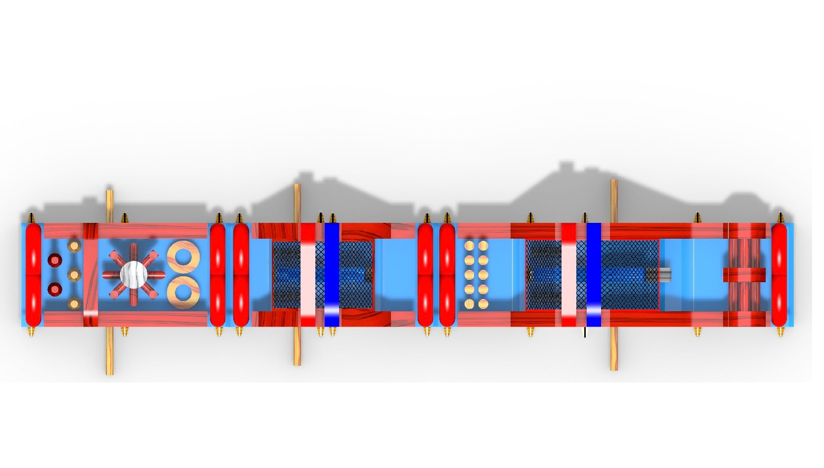 Two riders can play at a time as they race through countless different elements. Riders start off by going through the entrance (1) red arches, (2) vertical cone popups , (3) hanging vertical popups, (4) unique obstacle structure, (5) tire run obstacle, (6) dual red arches, (7) dual lane climber, (8) dual lane slide, (9) dual red arches. The second obstacle piece has (10) vertical popups, (11) dual lane climber, (12) dual lane slide, and lastly (13) horizontal popups.