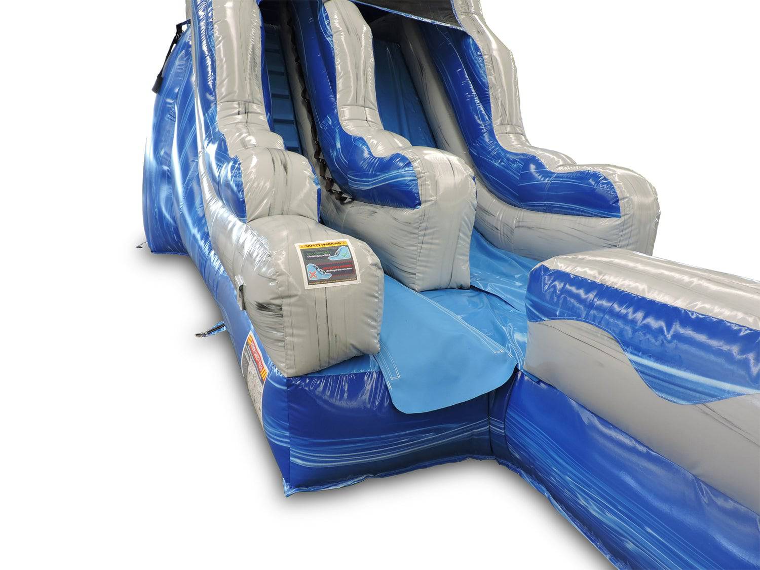 HullaBalloo's 15' tall Wave Inflatable Slide Wet/Dry is a summertime must-have. Great for all events and ages, use this slide wet or dry great for any time of the year. Use the non-slip stairs to climb to the top where you slide into an inflated pool. Our slides have a safety netting at the top of the slide, which includes a water mister. All our slides are hot welded to prevent any water leaks into the jumper. The slide lining is removable, making it easy to replace after it has been worn down. For easy disinflation, our slides have multiple zippers. All of our Slides are ASTM Compliant. They are made of fire retardant, high-quality, commercial vinyl. All Slides are 100% lead-free. This 15' tall Wave Inflatable Slide can be a great addition to your rental company inventory.