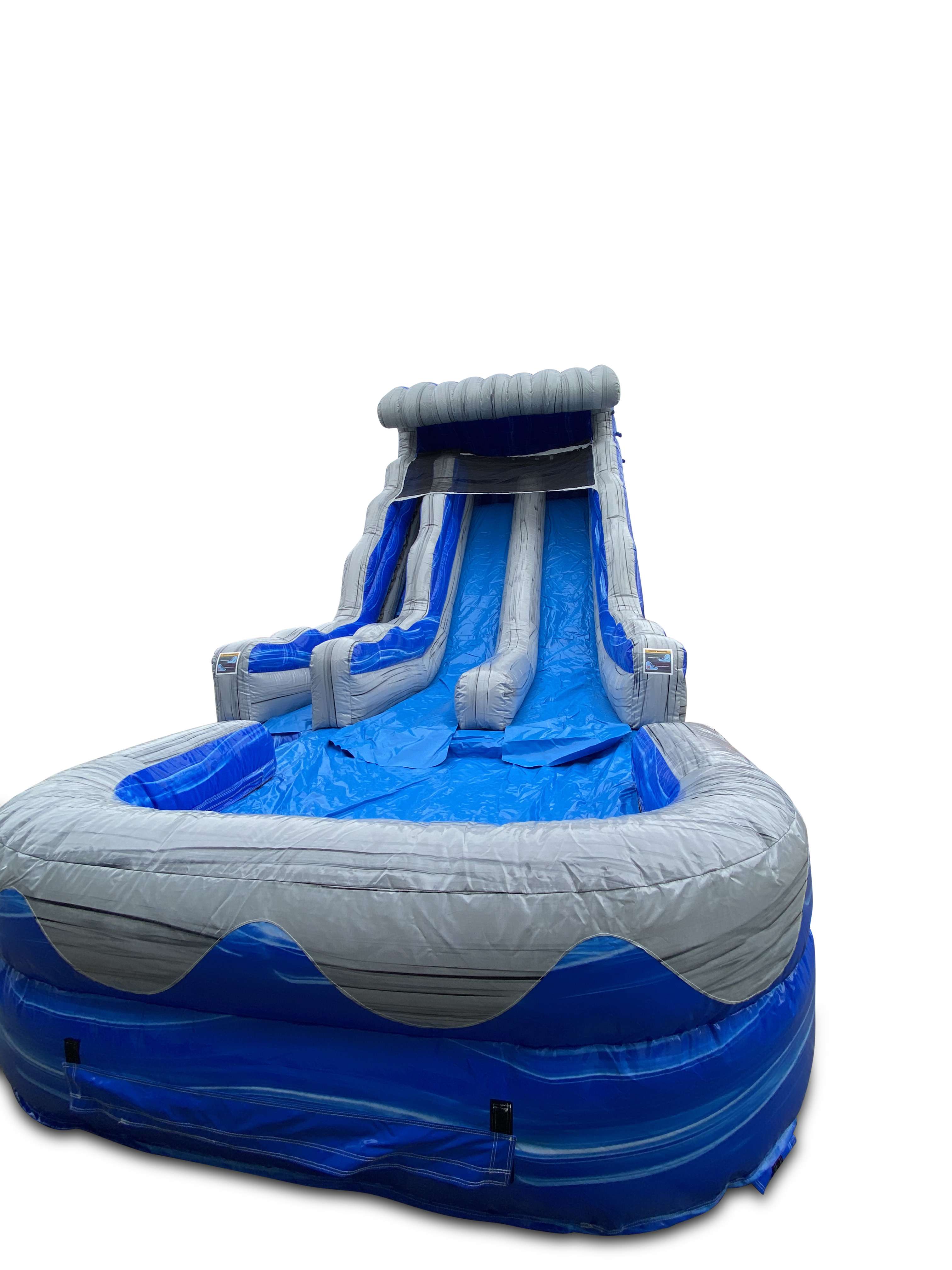 HullaBalloo's 18' tall Wave Inflatable Dual Slide Wet/Dry is a summertime must-have. Great for all events and ages, use this dual-slide wet or dry great for any time of the year. Use the non-slip stairs to climb to the top and have the option of not one but two slides, and you slide into an inflated pool. Our slides have a safety netting at the top of the slide, which includes a water mister. All our slides are hot welded to prevent any water leaks into the jumper. The slide lining is removable, making it easy to replace after it has been worn down. For easy disinflation, our slides have multiple zippers. All of our Slides are ASTM Compliant. They are made of fire retardant, high-quality, commercial vinyl. All Slides are 100% lead-free. This 18' Wave Inflatable with Dual Slides can be a great addition to your rental company inventory.