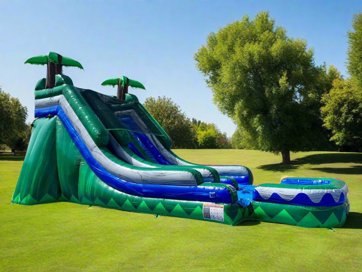 HullaBalloo's 18' tall Tropical Inflatable Dual Slide Wet/Dry is a summertime must-have. Great for all events and ages, use this dual slide wet or dry. Use the non-slip stairs to climb to the top and have the option of not one but two slides, and you slide into an inflated pool. Our slides have a safety netting at the top of the slide, which includes a water mister. All our slides are hot welded to prevent any water leaks into the jumper. The slide lining is removable, making it easy to replace after it has been worn down. For easy disinflation, our slides have multiple zippers. What is excellent about our Dual slide is that it can be used wet or dry, great to use for any time of the year. The dual slide has two inflatable palm trees at the top of each slide, perfect for tropical-themed parties. All of our Slides are ASTM Compliant. They are made of fire retardant, high-quality, commercial vinyl. All Slides are 100% lead-free.This 18' tall Tropical Inflatable with Dual Slides can be a great addition to your rental company inventory.