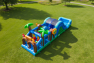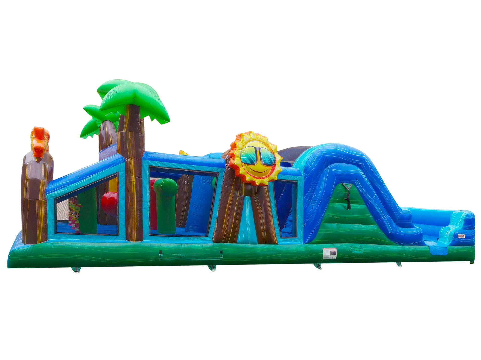 Step into a tropical adventure with the 38' Aloha Obstacle Course Wet/Dry Inflatable. Featuring vibrant colors, palm tree accents, and a lively tropical design, this inflatable instantly stands out at any event. At 38 feet long, this 2-person obstacle course invites racers to tackle climbing walls, twist through obstacles, and zoom down the slide to the finish.