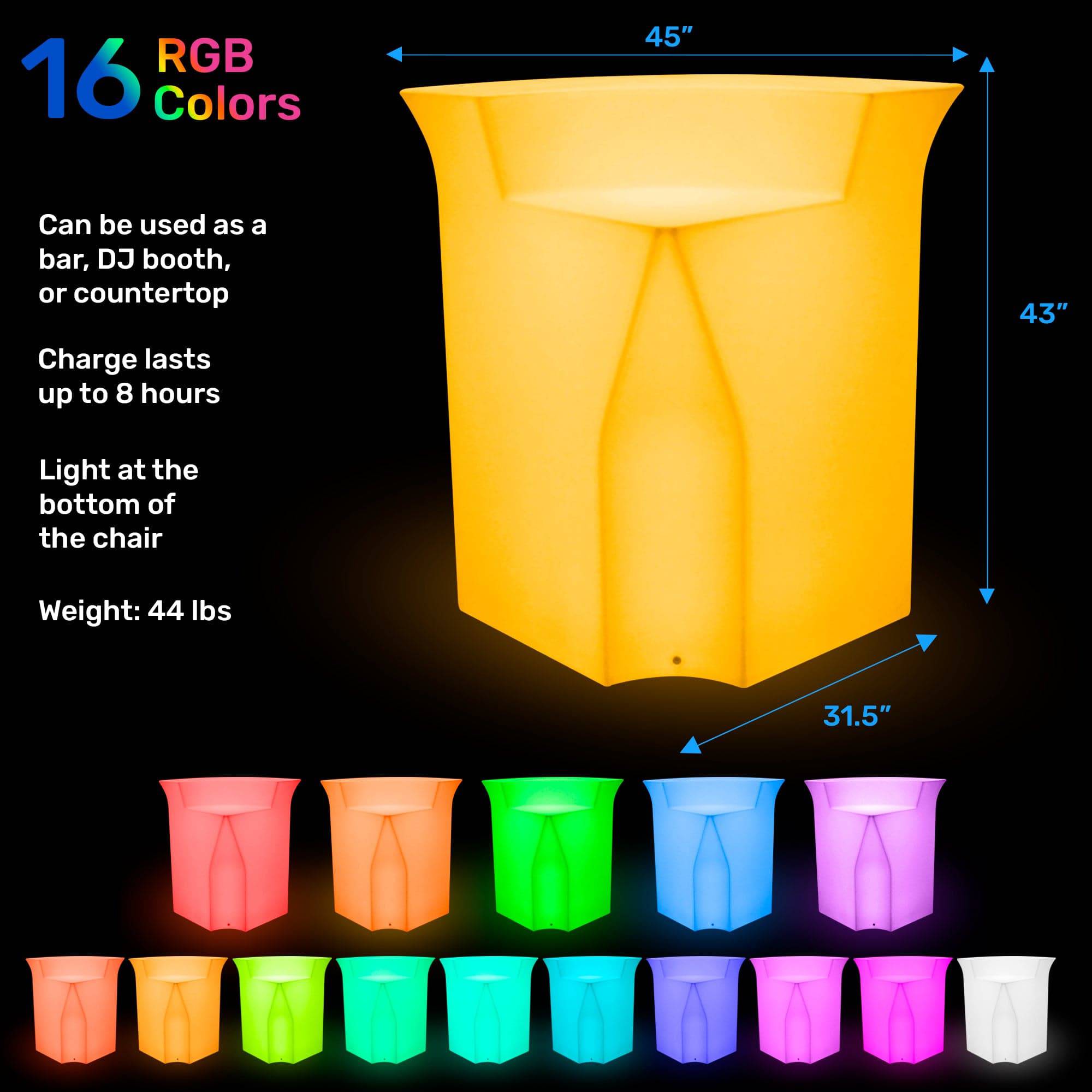 HullaBalloo Sales LED furniture is perfect for standing out from the rest. This LED bar counter can be used as a bar, DJ booth, or countertop. You can combine 4 LED bar counters to make a circle to create a full bar. The LED light is located at the bottom of the counter. Charger and remote are included. The charge for the LED bar counter lasts up to 8 hours. Shop HullaBalloo Sales LED Furniture for all your party rental needs!